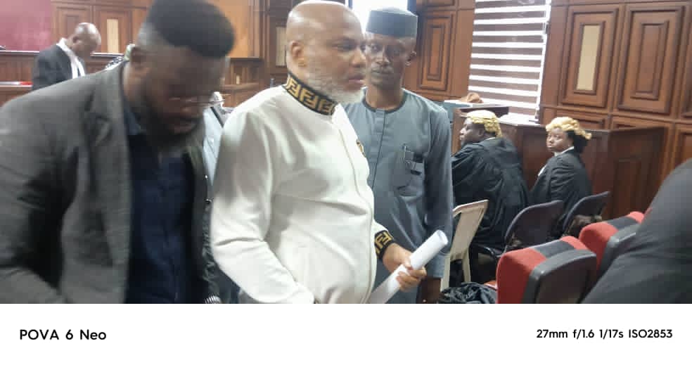 A lokacin da aka kira shari’ar domin saurare, Kanu ya shiga cikin akwatin masu tuhuma (dock) ɗauke da takardu da dama, inda ya sanar da kotun cewa shi da kansa ne zai wakilci kansa. Wannan na zuwa ne bayan janyewar lauya Kanu Agabi, SAN, da tawagarsa daga ci gaba da kare shi a jiya Alhamis.